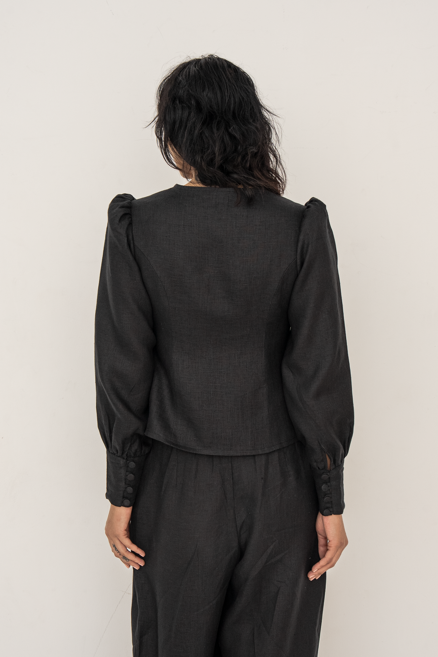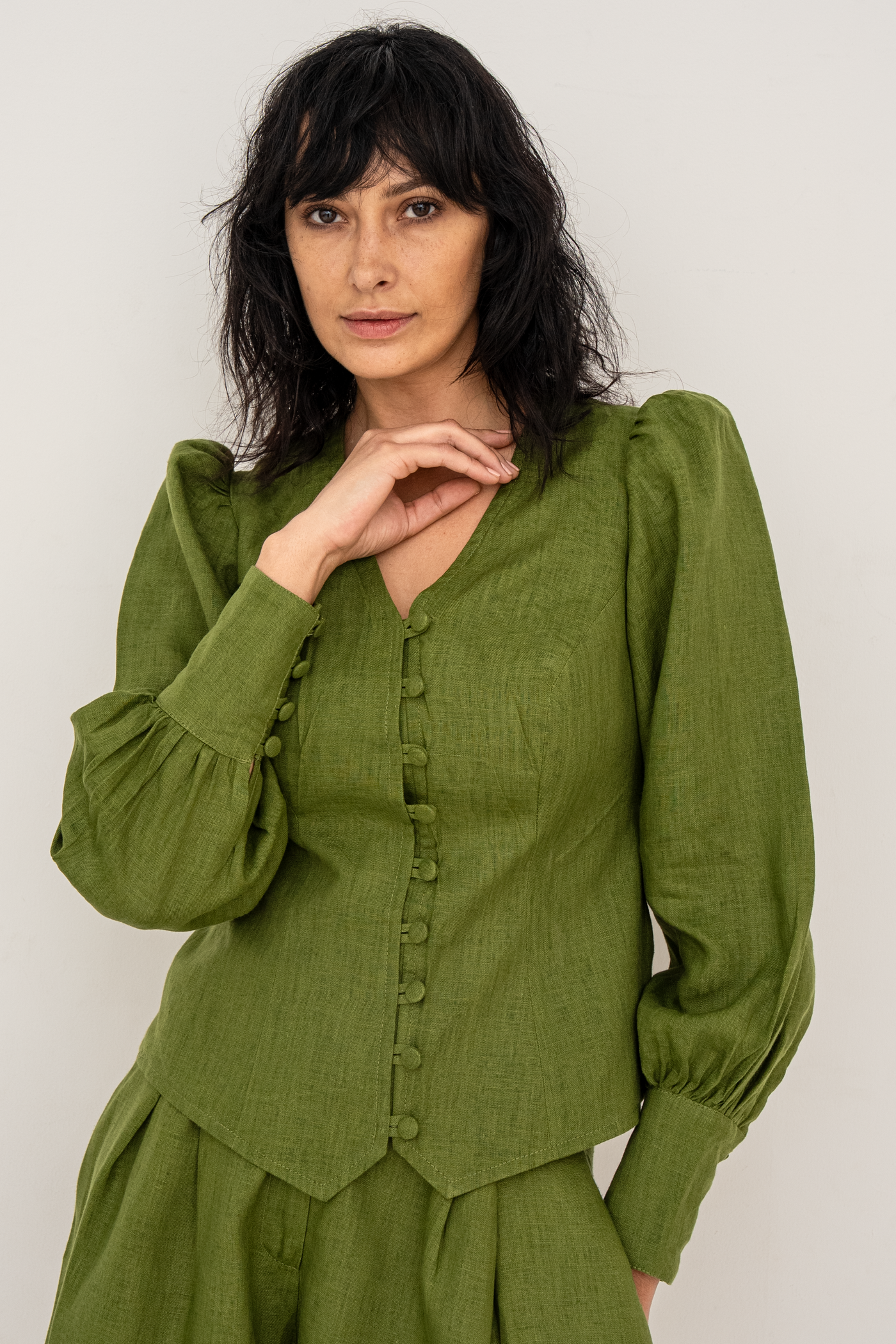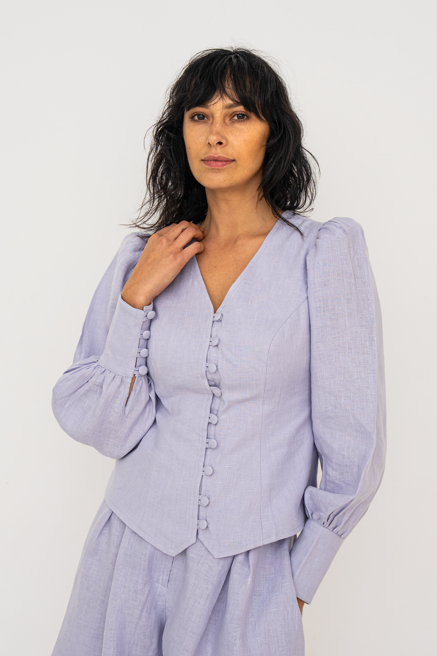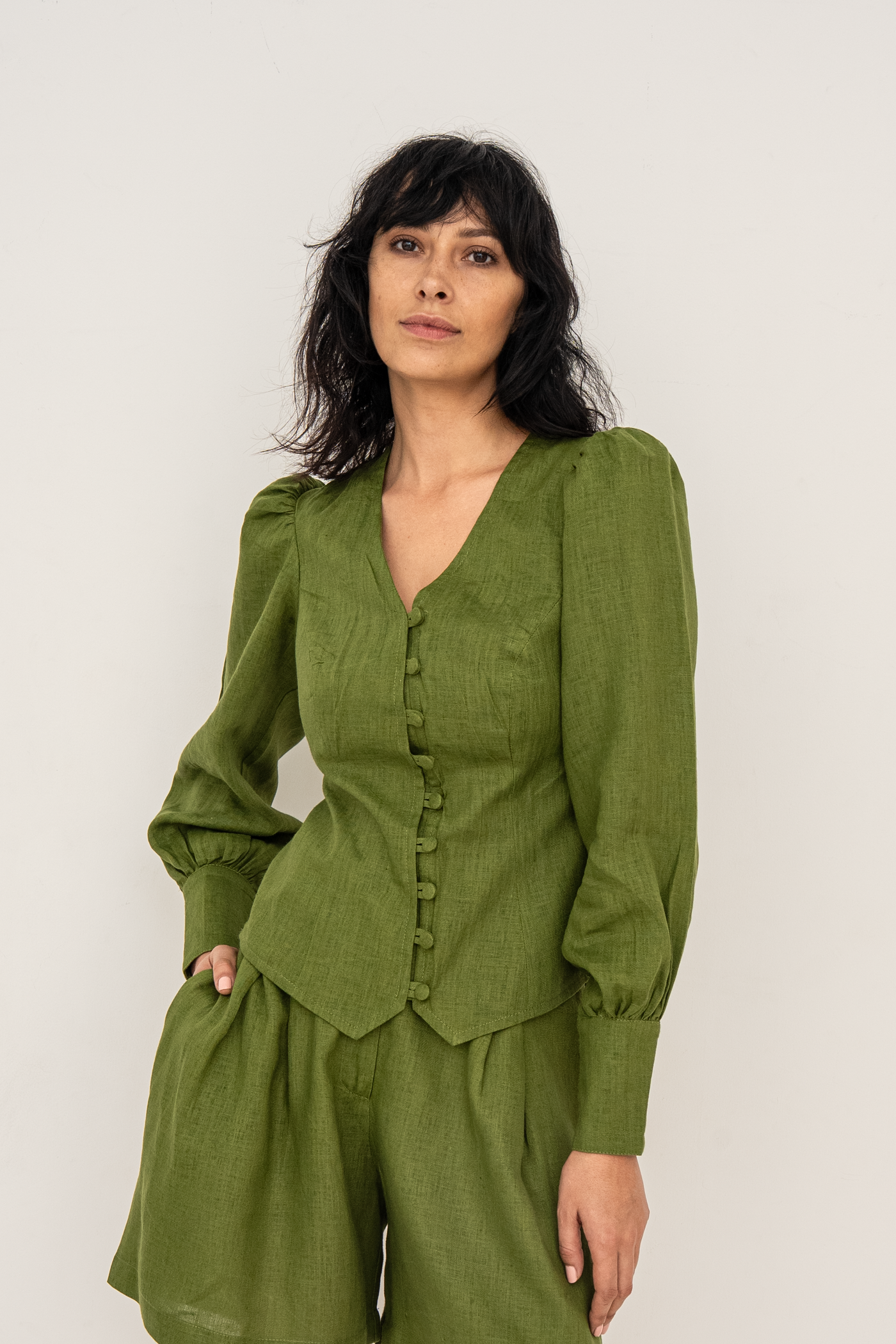Crafted from premium European linen, the Karina blouse embodies timeless elegance with a distinctly modern edge. The flattering V-neckline frames the décolletage with soft precision, while a gently sculpted waist defines the silhouette without compromising comfort. Fabric-covered buttons add a refined, couture-inspired detail, enhancing the blouse’s polished finish. Subtle puff sleeves introduce balanced volume, lending quiet drama and femininity to the overall shape.