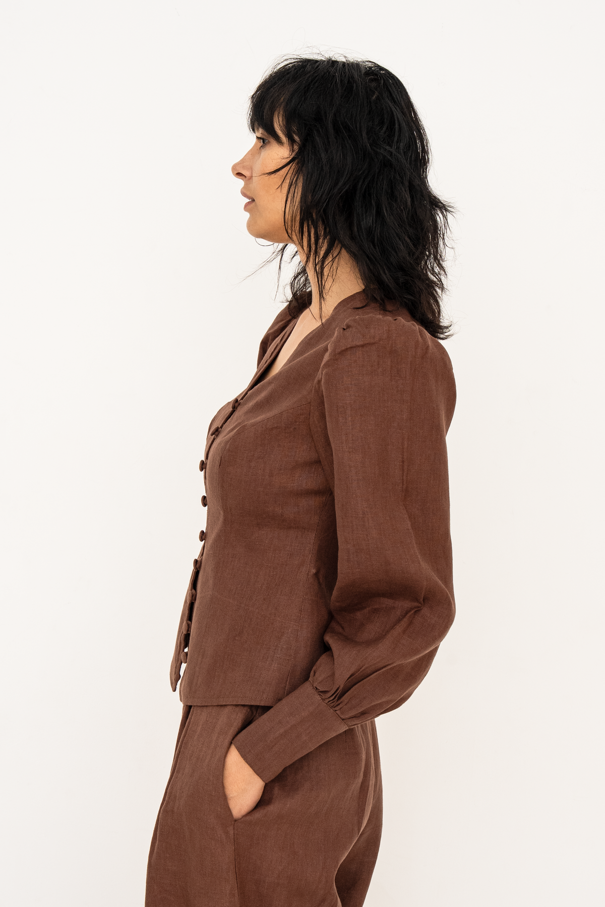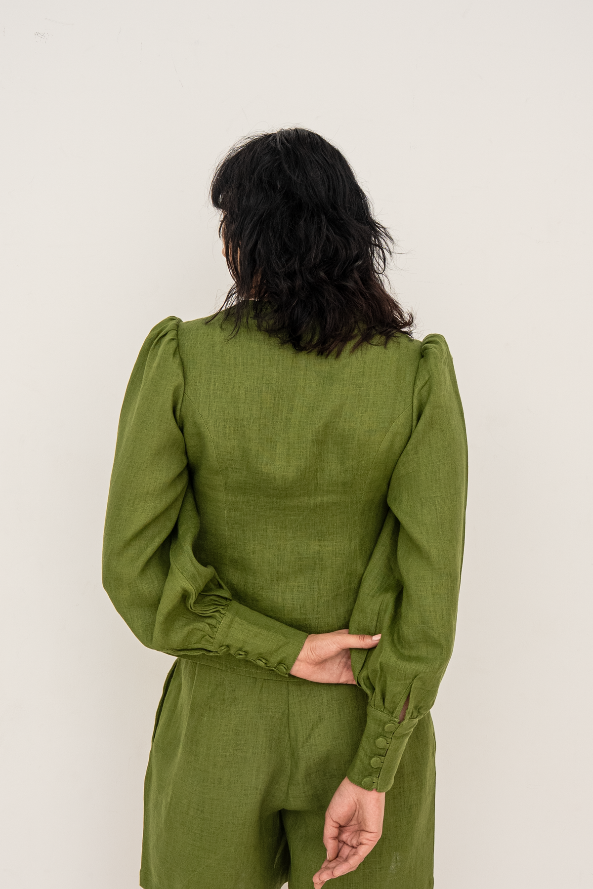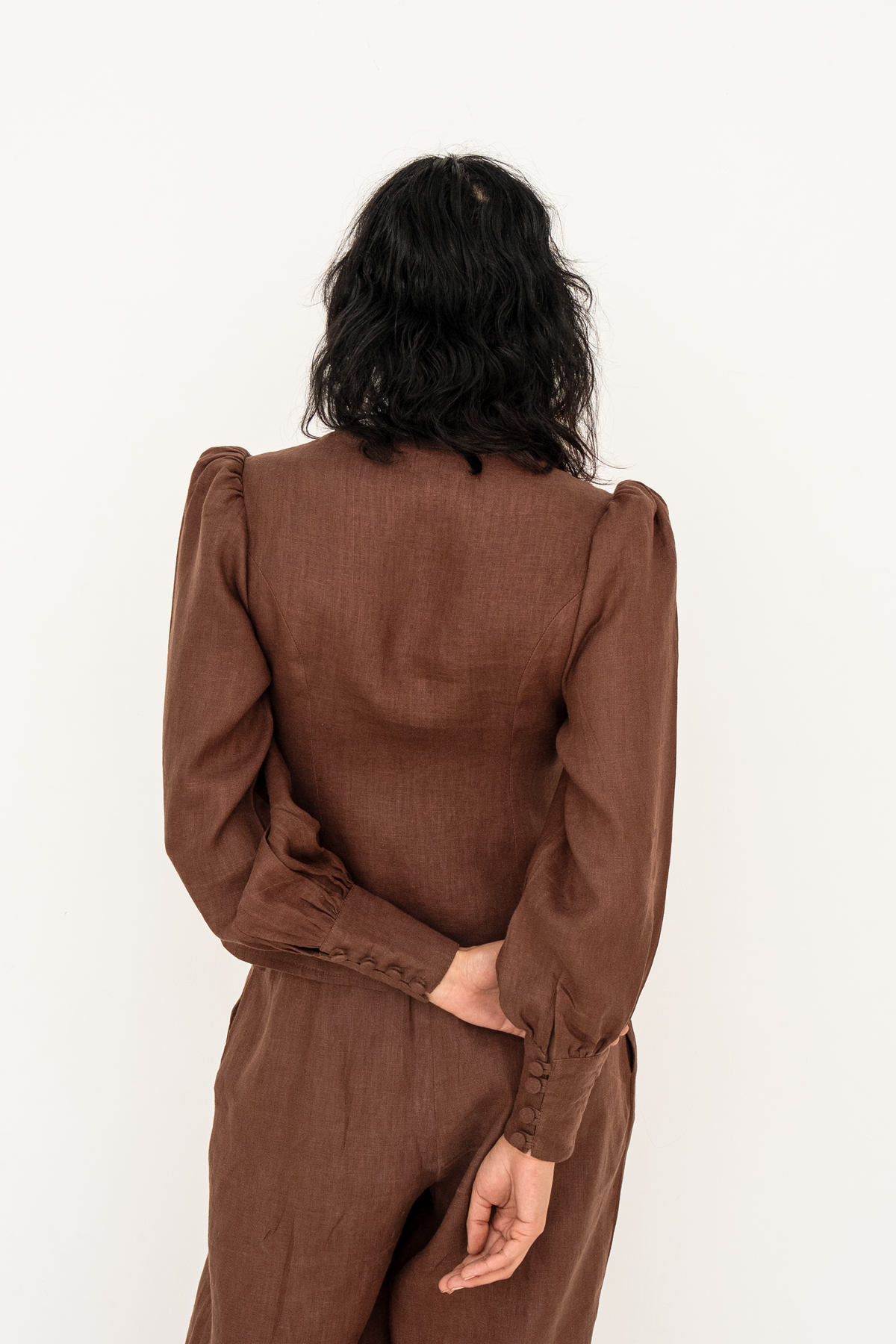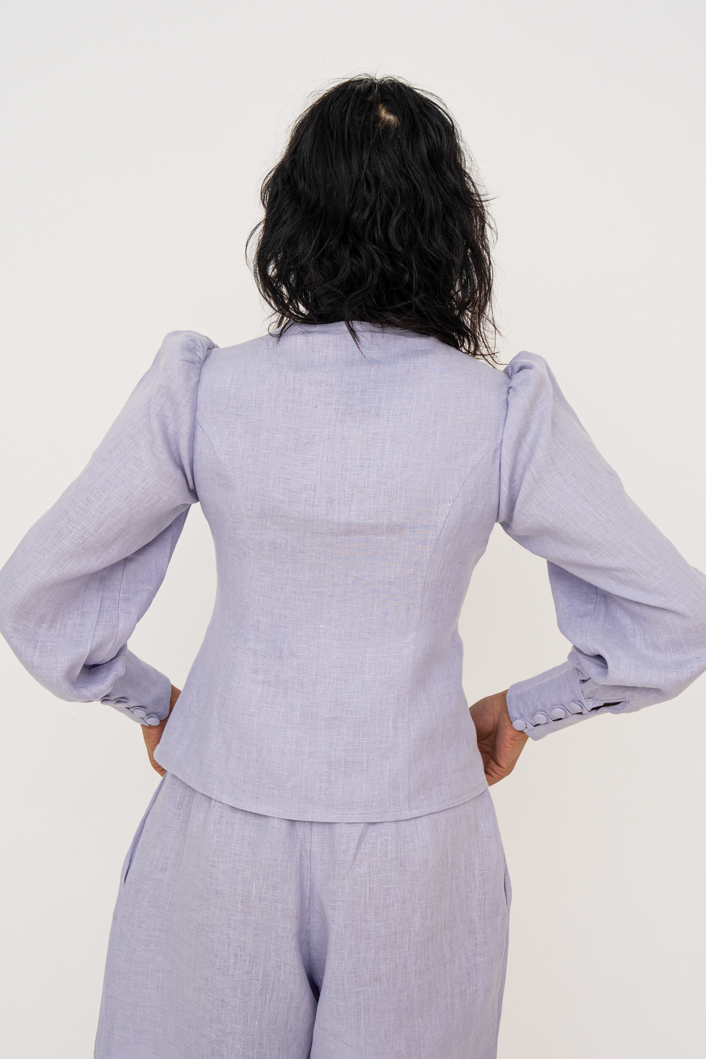 Crafted from premium European linen, the Karina blouse embodies timeless elegance with a distinctly modern edge. The flattering V-neckline frames the décolletage with soft precision, while a gently sculpted waist defines the silhouette without compromising comfort. Fabric-covered buttons add a refined, couture-inspired detail, enhancing the blouse’s polished finish. Subtle puff sleeves introduce balanced volume, lending quiet drama and femininity to the overall shape.